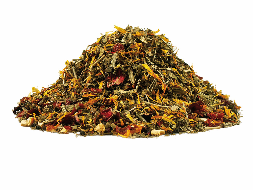Blackberry leaves, rose hips, elderberries, orange peels, lemon grass, hibiscus, marigold flowers, flavour. Breathing-fresh fruit-taste.