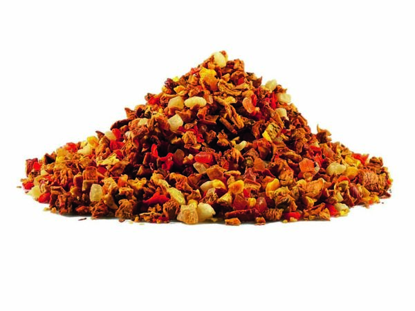 Apple pieces with vitamin C (apple pieces, flavour, acidulant: citric acid, vitamin C), pineapple cubes (12 %) (Cane sugar, pineapple, acidulant: citric acid), papaya cubes (papaya, sugar), peach pieces (5,25 %) (Peach, preservative: SULPHUR DIOXIDE, rice flour), carrot flakes, flavour, mango fruit granules (glucose syrup (wheat), mango puree concentrate, thickening agent: sodium alginate), passion fruit granules (glucose syrup (wheat), passion fruit juice concentrate, apricot pulp, modified starch (potato), thickening agent: sodium alginate). Cool pineapple-peach-taste.